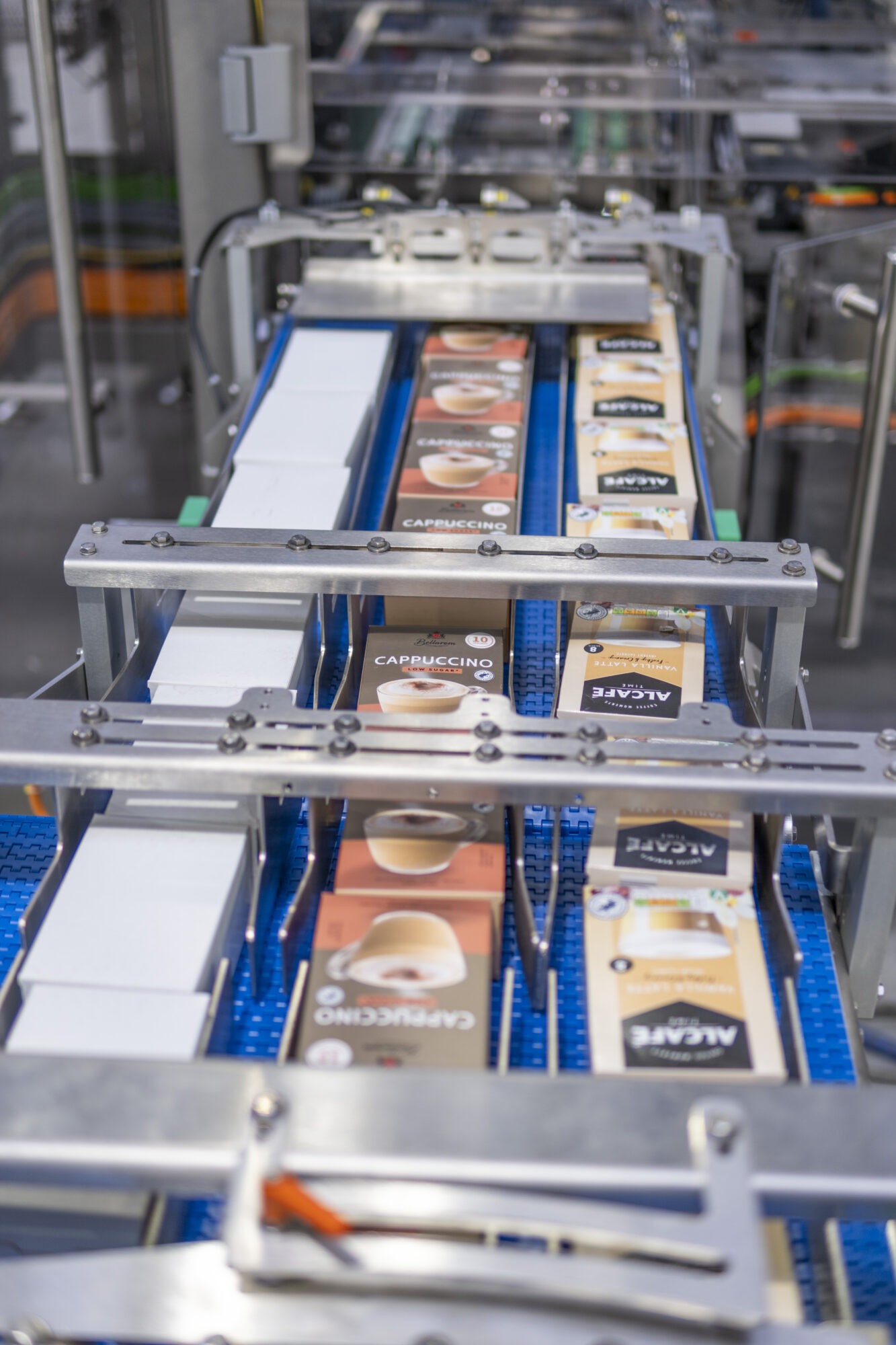 The ST800 machine with 10 lanes produces stickpack bags with precise dosing using a auger filler. Pick and place units orient the finished bags and insert them into boxes using a CAM-I cartoning machine with a side-load process. Three product inputs then pass into the CAM-W machine, where they are combined and packed into transport cartons with an attractive design suitable for direct display. Each step of the process has been designed to ensure high capacity, smooth operation, and maximum efficiency.