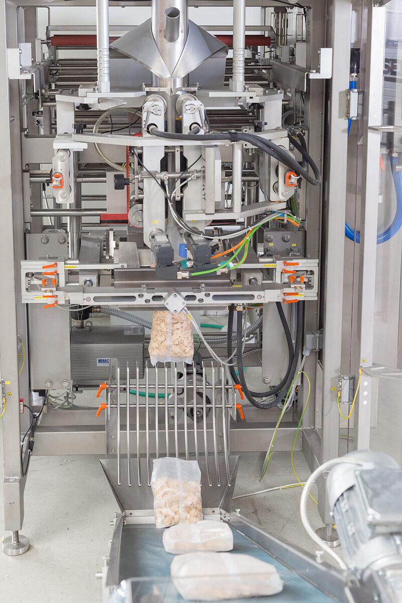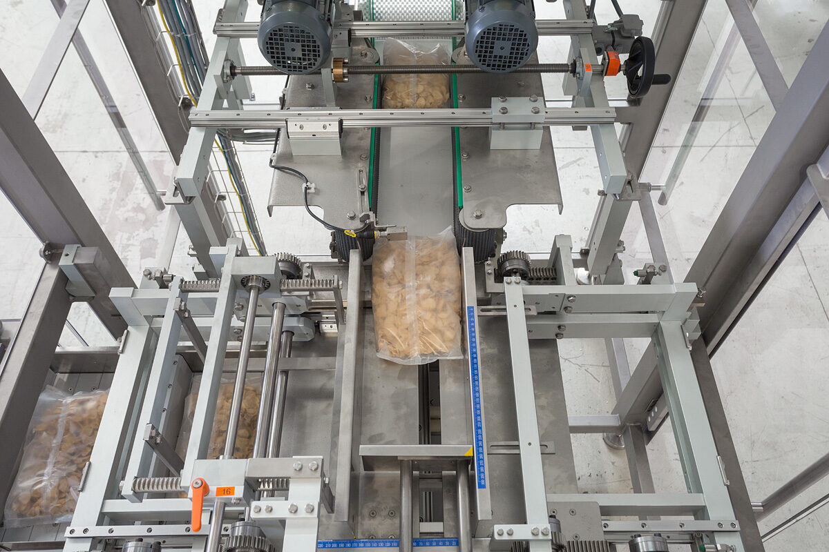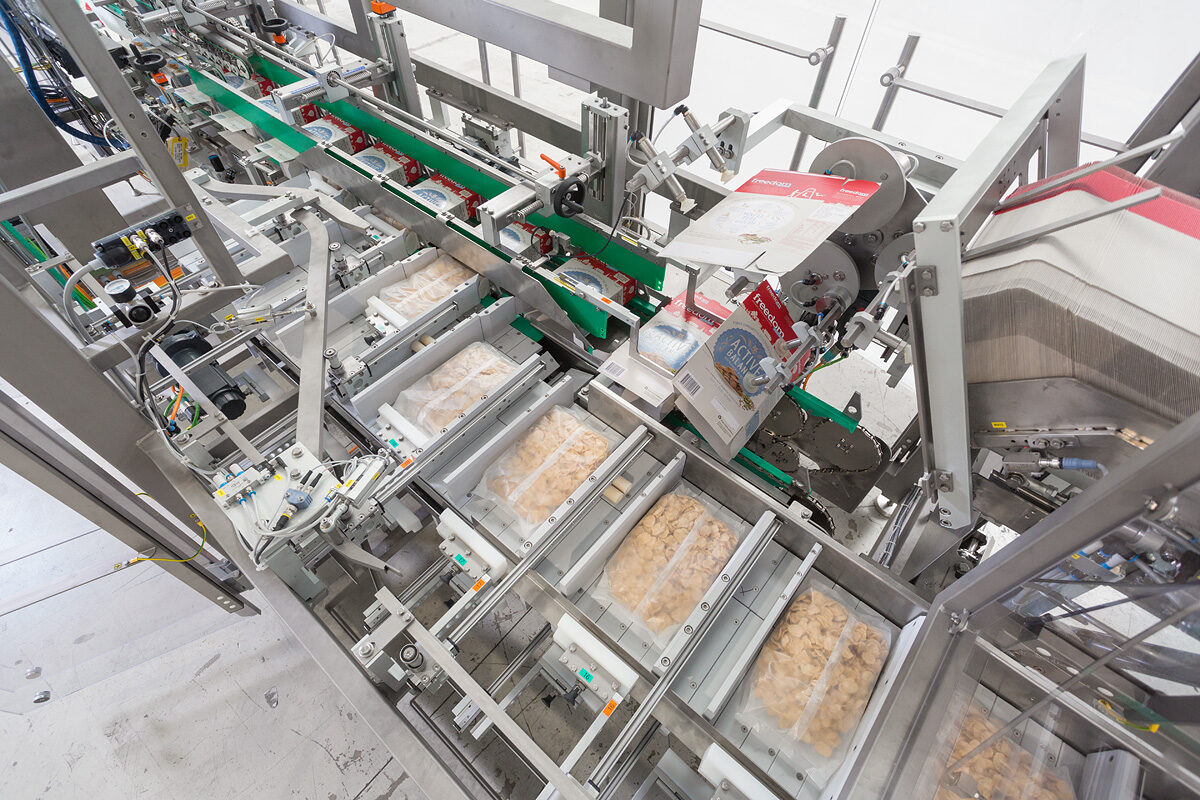 The packaging line for packaging cereals in pillow bags uses the S400 vertical packaging machine in combination with combination weighers. The LOM unit handles the bags and ensures their correct orientation for further processing. The output is connected to a CAM-C side-load cartoning machine, which automatically loads the bags into cartons and seals them with hot glue. The entire solution is designed for high capacity, smooth operation, and minimal downtime.