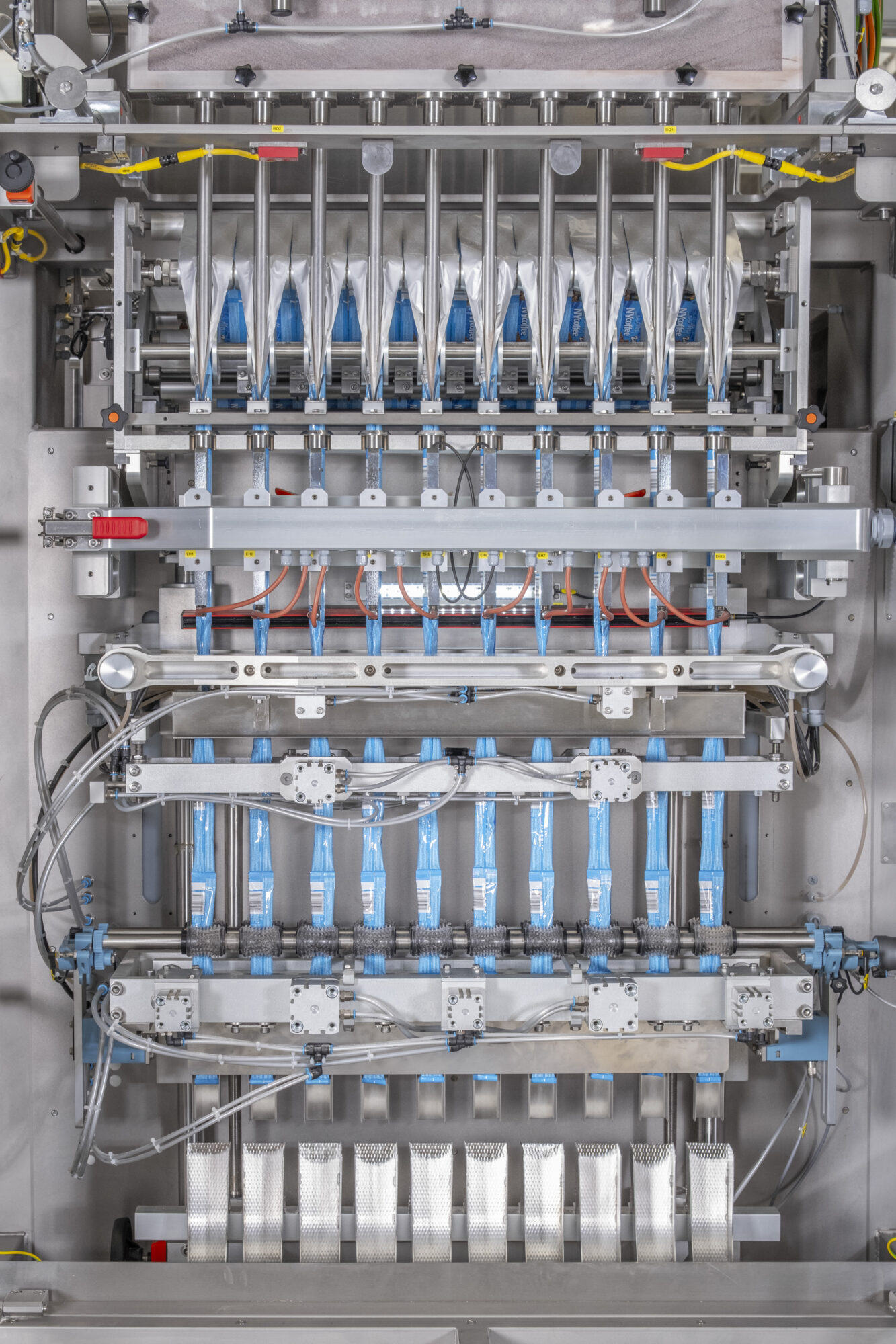 The ST800 produces 3 side sealed sticks containing instant coffee in ten lanes with precise dosing using a auger filler. The finished sticks are transferred by a bucket conveyor to a counting station, which creates precise batches for subsequent packaging on the S300 machine. This machine creates bags with quad seal and a flat bottom. The entire solution allows for flexible configuration for different quantities and sizes of bags and ensures high speed, accuracy, and smooth production. The result is an efficient stick-in-box system for packaging instant coffee in consumer packages.